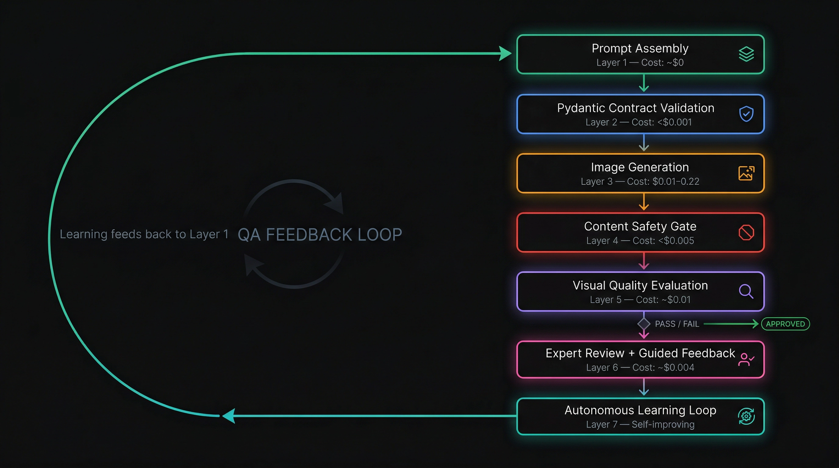 The validated prompt hits the image generation API. This is the most expensive step in the pipeline, which is why Layers 1 and 2 exist to prevent wasted generation credits. Only prompts that pass assembly logic and contract validation reach this point.